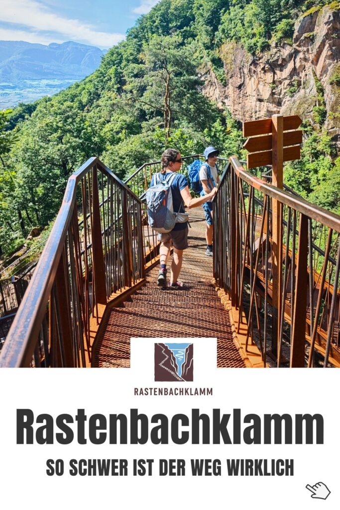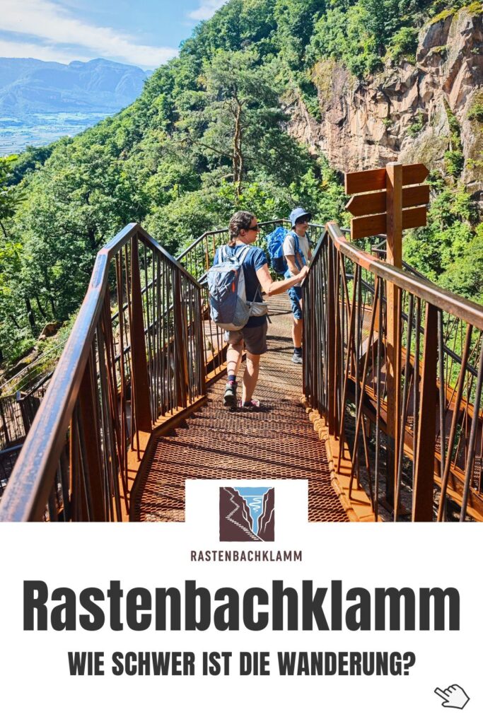 Die Wanderung durch die Rastenbachklamm ist landschaftlich wirklich toll und der Rastenbachklamm Schwierigkeitsgrad ist seit dem Neubau der Stiegen insgesamt leichter geworden. Der Weg durch die Klamm ist technisch als mittelschwer eingestuft. Der konditionelle Schwierigkeitsgrad hängt davon ab, wo du los wanderst und welche der Wanderungen du durch die Klamm unternimmst. Wer direkt vom Müllereck startet, muss nur rund 165 Höhenmeter überwinden und ist gut eine Stunde durch die Klamm unterwegs. Anspruchsvoller wird es, wenn du am Kalterer See in St. Josef am See loswanderst. Dann warten rund 270 Höhenmeter auf dich, die aber auch keine große Herausforderung für Wanderer darstellen.