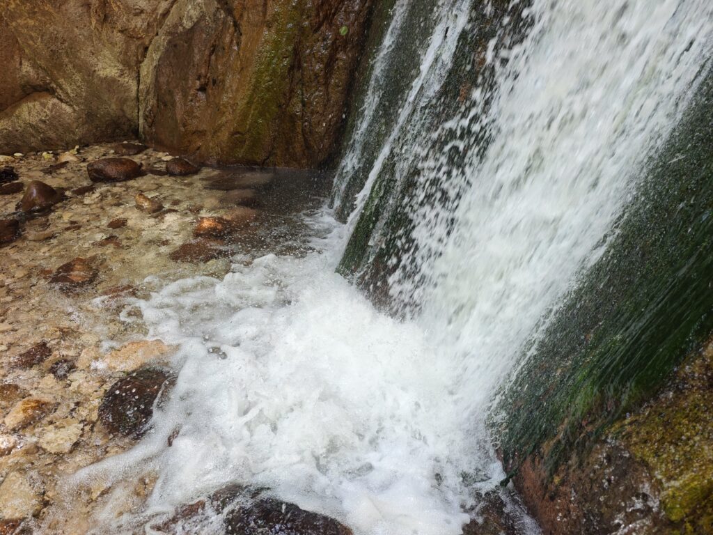 Der Wasserfall selbst ist über einen kleinen, aber steilen und oft rutschigen Pfad vom Hauptweg aus erreichbar. Ein Wanderschild weist dir den Weg. Obwohl dieser Abstieg einen kleinen Umweg bedeutet, lohnt sich die Mühe. Am Fuße des Wasserfalls angekommen, eröffnet sich ein schattiger und friedlicher Platz. Das unaufhörliche Rauschen des Wassers dominiert die Geräuschkulisse und erzeugt eine meditative Atmosphäre, die zum Verweilen und Entspannen einlädt. Die umgebenden Felswände und die dichte Vegetation tragen zur angenehmen Stimmung bei.
